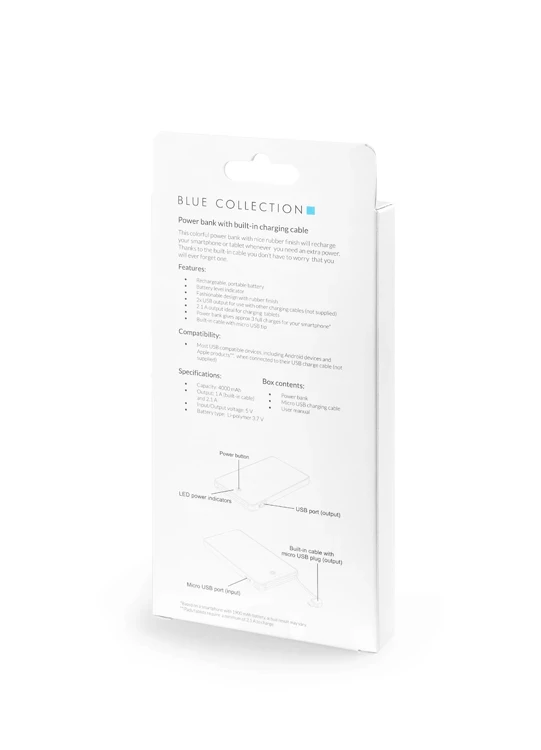 Le power bank VIVID 4000 mAh est un gadget promotionnel moderne qui allie fonctionnalité et esthétique et constitue un cadeau pratique pour les clients et les partenaires commerciaux. Grâce à son design fin et à sa surface caoutchoutée, l'appareil est non seulement pratique mais aussi agréable au toucher. Le câble micro USB intégré et le port USB supplémentaire permettent de recharger deux appareils simultanément, ce qui augmente son utilité au quotidien. De plus, la possibilité d'imprimer des UV en couleur sur la surface du power bank permet une promotion efficace de la marque.