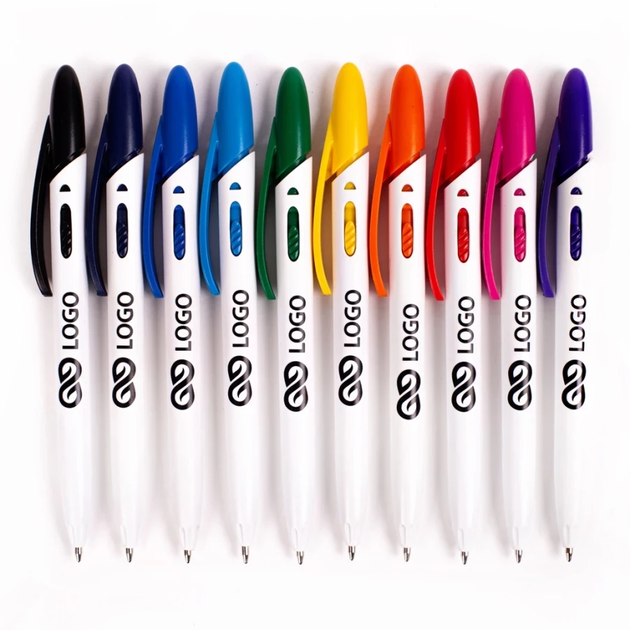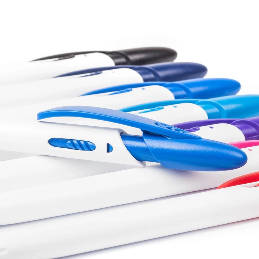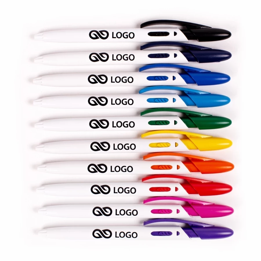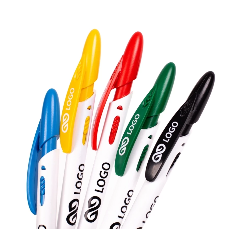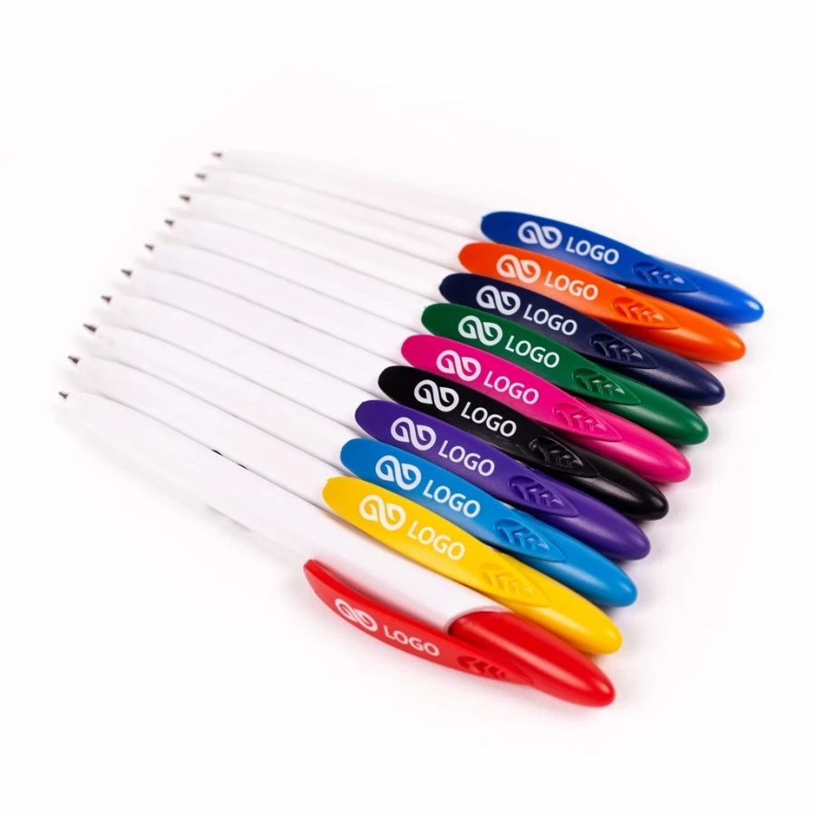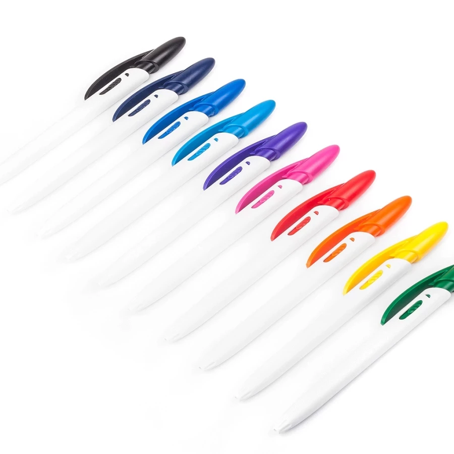 Un autre modèle de la ligne Rico est un stylo qui se distingue nettement des autres gadgets promotionnels. Le Rico White se caractérise par un corps blanc en plastique opaque. La ligne droite constitue la base parfaite pour toute impression publicitaire. Le mécanisme à bouton-poussoir est un ajout qui rompt la monotonie et donne au stylo une touche individuelle. Le blanc, complété par les couleurs expressives qui composent le design original de la partie supérieure du corps, fait vraiment bonne impression. L'agrafe arrondie souligne encore le caractère unique de ce modèle.